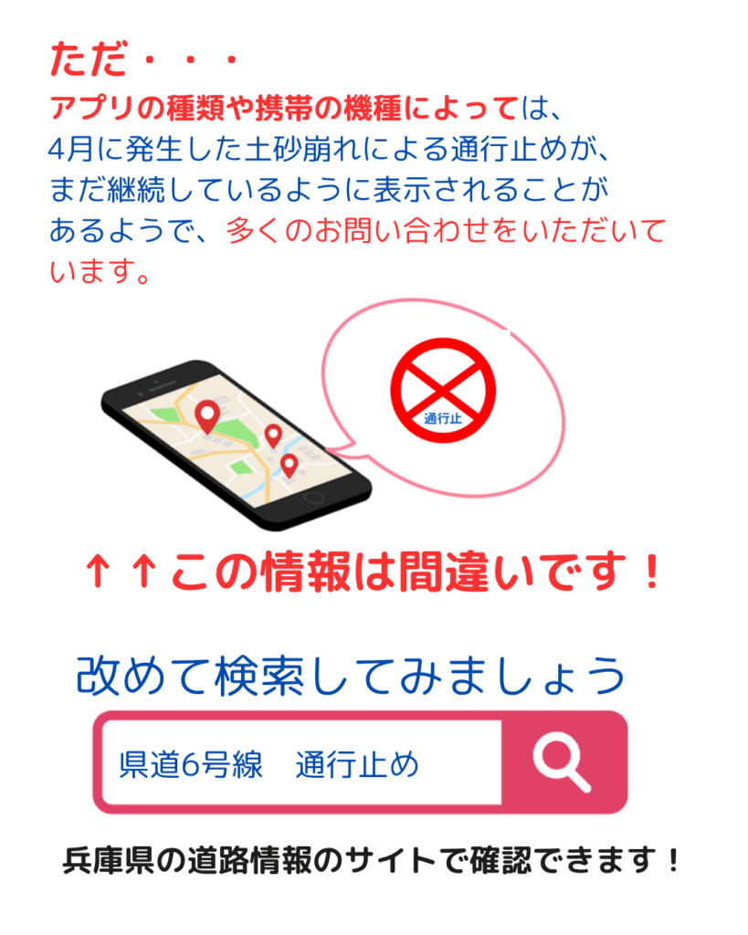 4月に土砂崩れの発生によって一時通行止めがあった県道6号線ですが、4月23日の通行止め解消から3か月経過してもなお、一部のマップアプリや一部の機種では通行止めのマークが表示されるとのこと。
